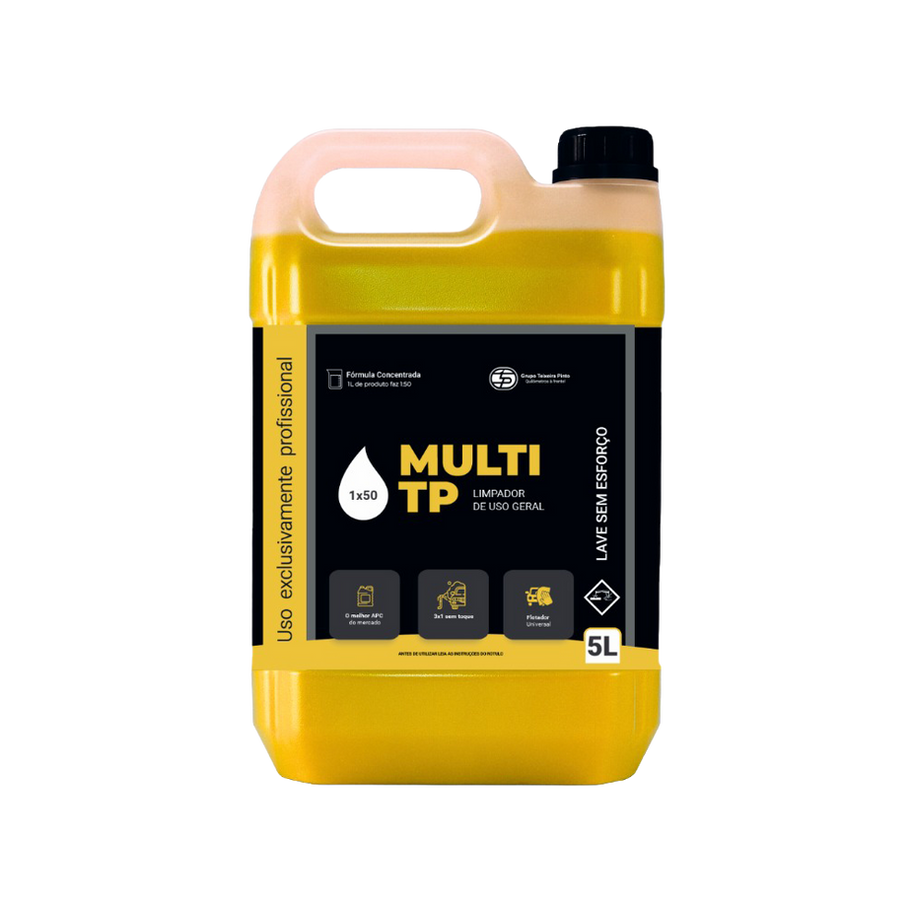 Multi TP é um limpador de uso geral. Limpa facilmente qualquer superfície que suporte água, como estofados, painéis plásticos, couro, borracha, carpetes, fórmica, pisos vinílicos e cerâmicos, motores automotivos, chassis, caixa de rodas, rodas e pneus, latarias, lonas tipo sider, capotas marítimas, máquinas industriais e fogões, ajustando as diluições recomendadas.
